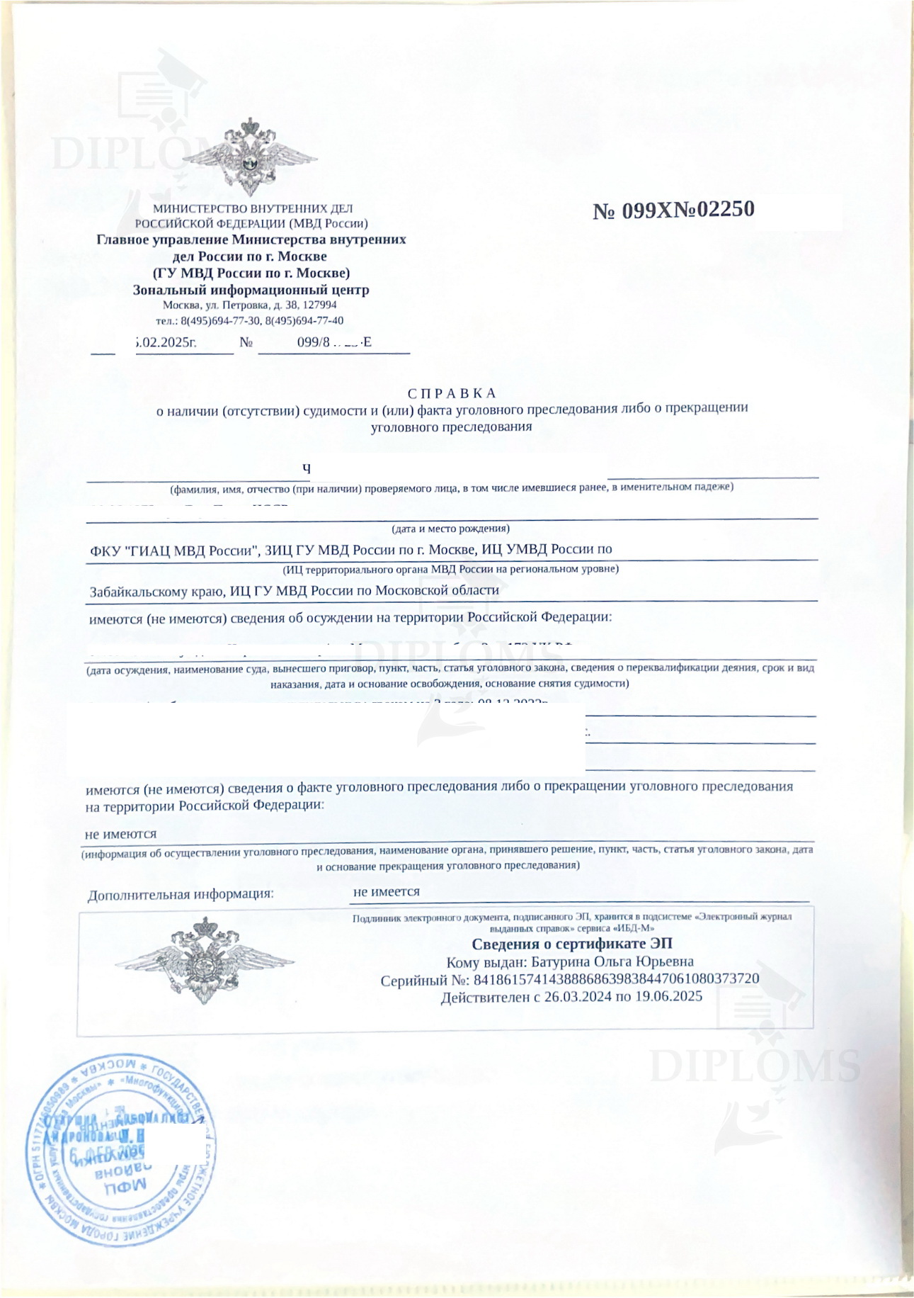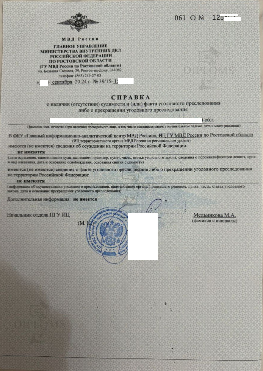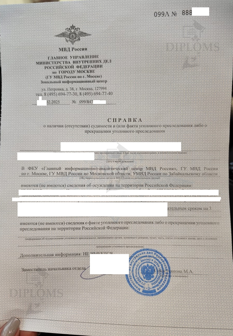 На что обратить внимание при покупке справки о несудимости? Очень многие организации делают справки только от определённых (популярных) регионов. Мы можем сделать справку о несудимости из любого региона/информационного центра. У нас есть образцы всех областей, республик, краев Российской Федерации. Эта база нарабатывалась годами. Также у нас самая большая база апостилей из всех регионов. Образцы справок о несудимости Из МВД (регионального информационного центра) Из МФЦ С портала Госуслуг С апостилем Апостиль нужен для предъявления документа за границами Российской Федерации. Мы делаем справки о несудимости от любых учреждений (МФЦ, МВД, с Госуслуг) и от любого региона Российской Федерации. От каких учреждений можно сделать справку о несудимости? Компания «Diploms» делает справки от МФЦ и от МВД. Также мы можем сделать электронный вариант, если вы заказываете справку в Интернете через портал Госуслуг. Это специальный PDF-файл, идентичный тому, что вы получаете через ГосУслуги. Что такое — чистая справка о несудимости? Чистая справка о несудимости — значит справка в которой стоят пометки — «НЕ ИМЕЮТСЯ, НЕ ИМЕЮТСЯ, НЕ ИМЕЕТСЯ». Это означает, что человек который получил данную справку не был судим никогда. Если вам нужна чистая справка — мы можем сделать это без дополнительных доплат. Как быстро купить справку о несудимости? Лучший способ быстро получить справку — заказать её на сайте Дипломс. Мы предлагаем сделать справку о несудимости без личного присутствия в самые сжатые сроки. От вас нужна только заявка в представленной форме заказа. Как только мы получим ее, мы свяжемся с вами в рабочее время, обсудим все детали и отдадим заказ в работу. |